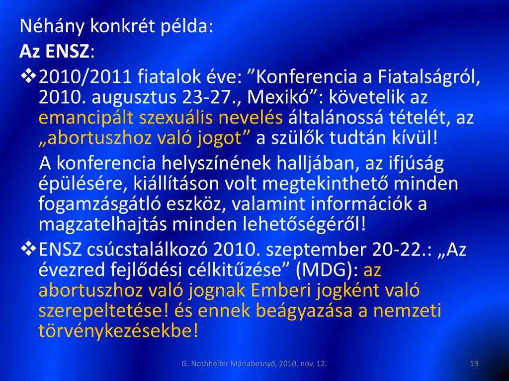 Néhány konkrét példa: Az ENSZ: • 2010/2011 fiatalok éve: ”Konferencia a Fiatalságról, 2010. augusztus 23-27., Mexikó”: követelik az emancipált szexuális nevelés általánossá tételét, az „abortuszhoz való jogot” a szülők tudtán kívül! A konferencia helyszínének halljában, az ifjúság épülésére, kiállításon volt megtekinthető minden fogamzásgátló eszköz, valamint információk a magzatelhajtás minden lehetőségéről! • ENSZ csúcstalálkozó 2010. szeptember 20-22.: „Az évezred fejlődési célkitűzése” (MDG): az abortuszhoz való jognak Emberi jogként való szerepeltetése! és ennek beágyazása a nemzeti törvénykezésekbe! G. Nothhelfer Máriabesnyő, 2010. nov. 12.