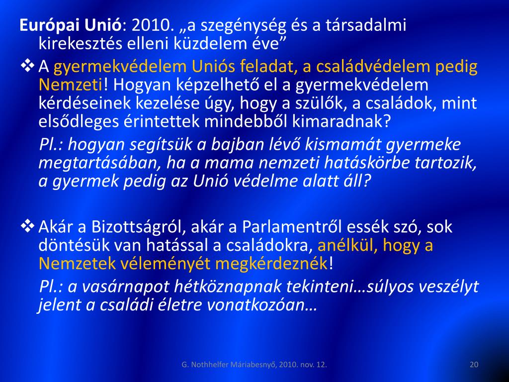 Európai Unió: 2010. „a szegénység és a társadalmi kirekesztés elleni küzdelem éve” • A gyermekvédelem Uniós feladat, a családvédelem pedig Nemzeti! Hogyan képzelhető el a gyermekvédelem kérdéseinek kezelése úgy, hogy a szülők, a családok, mint elsődleges érintettek mindebből kimaradnak? Pl.: hogyan segítsük a bajban lévő kismamát gyermeke megtartásában, ha a mama nemzeti hatáskörbe tartozik, a gyermek pedig az Unió védelme alatt áll? • Akár a Bizottságról, akár a Parlamentről essék szó, sok döntésük van hatással a családokra, anélkül, hogy a Nemzetek véleményét megkérdeznék! Pl.: a vasárnapot hétköznapnak tekinteni…súlyos veszélyt jelent a családi életre vonatkozóan… G. Nothhelfer Máriabesnyő, 2010. nov. 12.