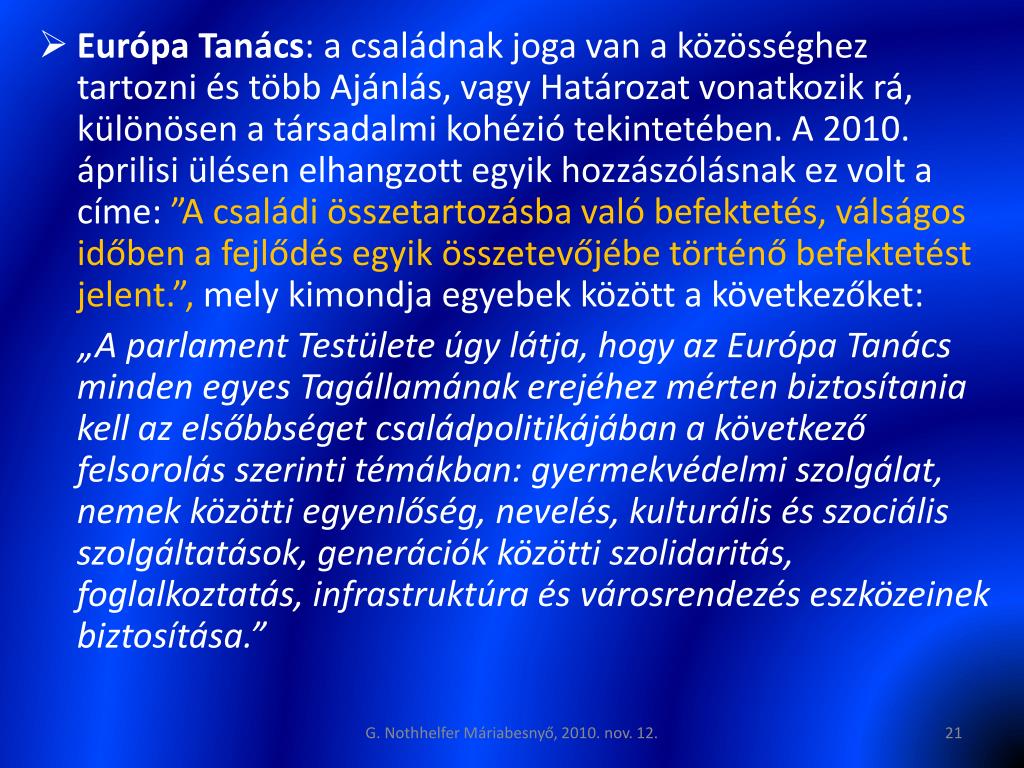 Európa Tanács: a családnak joga van a közösséghez tartozni és több Ajánlás, vagy Határozat vonatkozik rá, különösen a társadalmi kohézió tekintetében. A 2010. áprilisi ülésen elhangzott egyik hozzászólásnak ez volt a címe: ”A családi összetartozásba való befektetés, válságos időben a fejlődés egyik összetevőjébe történő befektetést jelent.”, mely kimondja egyebek között a következőket: „A parlament Testülete úgy látja, hogy az Európa Tanács minden egyes Tagállamának erejéhez mérten biztosítania kell az elsőbbséget családpolitikájában a következő felsorolás szerinti témákban: gyermekvédelmi szolgálat, nemek közötti egyenlőség, nevelés, kulturális és szociális szolgáltatások, generációk közötti szolidaritás, foglalkoztatás, infrastruktúra és városrendezés eszközeinek biztosítása.” G. Nothhelfer Máriabesnyő, 2010. nov. 12.
