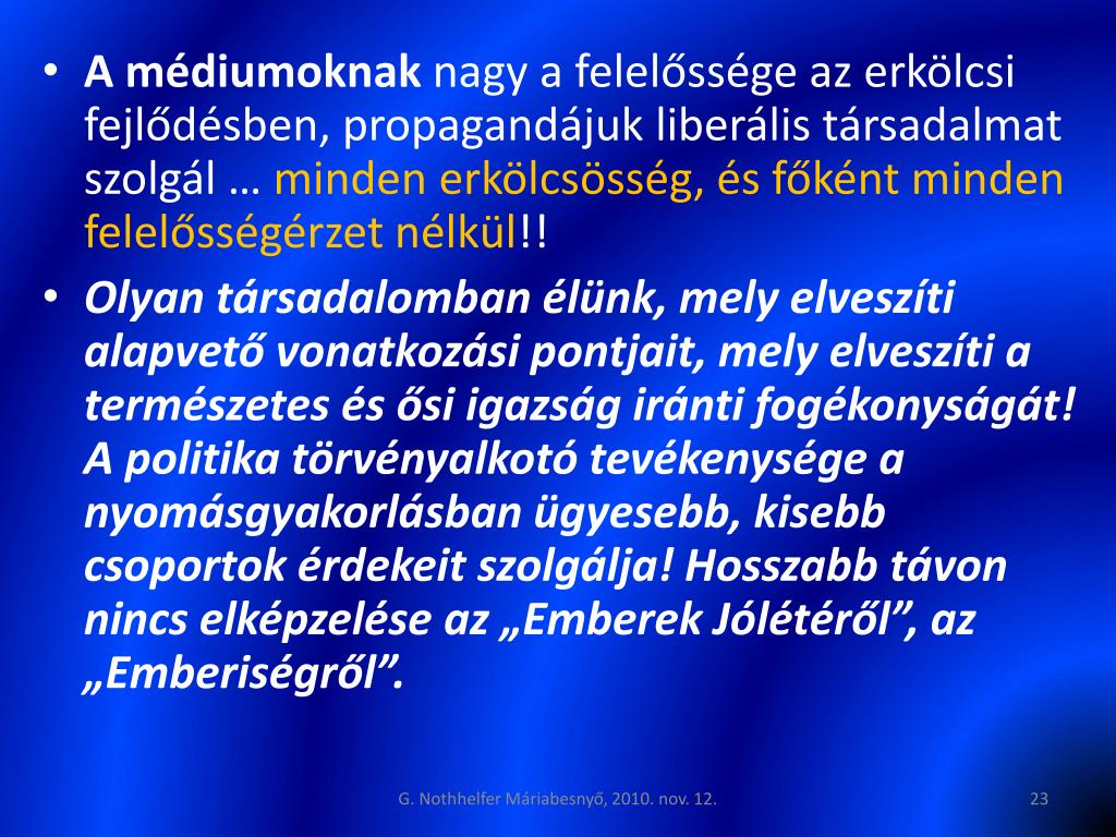A médiumoknak nagy a felelőssége az erkölcsi fejlődésben, propagandájuk liberális társadalmat szolgál … minden erkölcsösség, és főként minden felelősségérzet nélkül!! • Olyan társadalomban élünk, mely elveszíti alapvető vonatkozási pontjait, mely elveszíti a természetes és ősi igazság iránti fogékonyságát! A politika törvényalkotó tevékenysége a nyomásgyakorlásban ügyesebb, kisebb csoportok érdekeit szolgálja! Hosszabb távon nincs elképzelése az „Emberek Jólétéről”, az „Emberiségről”. G. Nothhelfer Máriabesnyő, 2010. nov. 12.