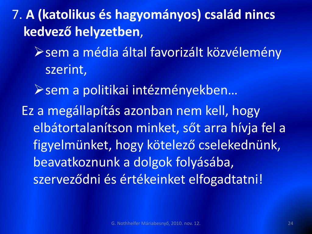 7. A(katolikus és hagyományos) család nincs kedvező helyzetben, • sem a média által favorizált közvélemény szerint, • sem a politikai intézményekben… Ez a megállapítás azonban nem kell, hogy elbátortalanítson minket, sőt arra hívja fel a figyelmünket, hogy kötelező cselekednünk, beavatkoznunk a dolgok folyásába, szerveződni és értékeinket elfogadtatni! G. Nothhelfer Máriabesnyő, 2010. nov. 12.