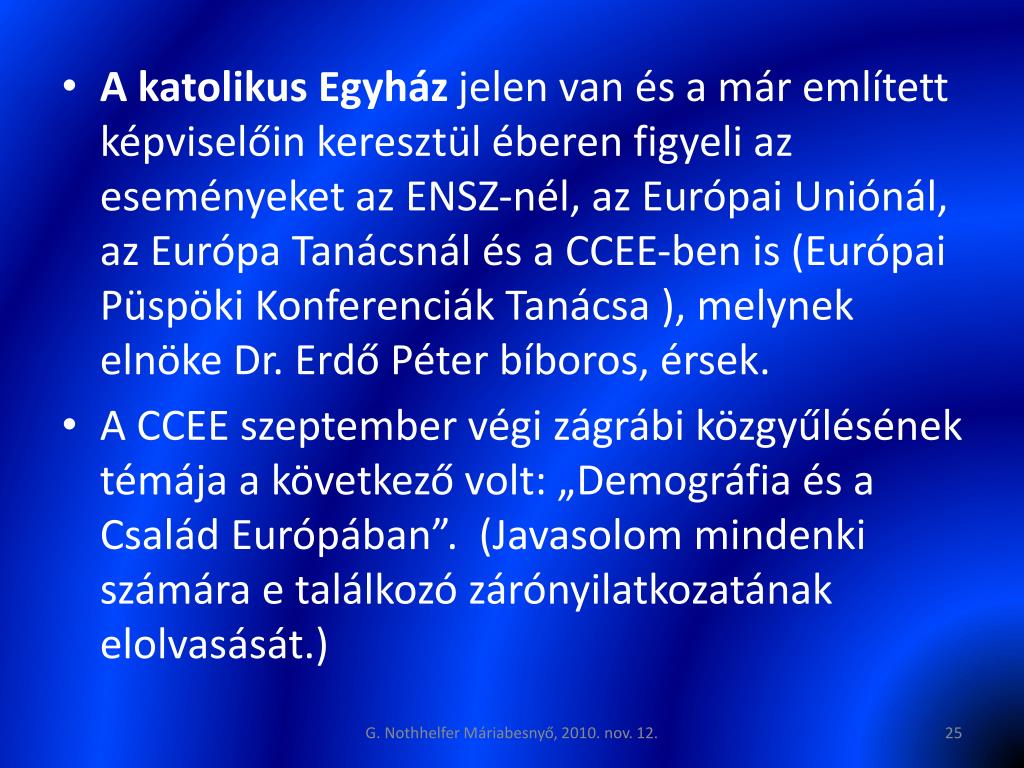 A katolikus Egyház jelen van és a már említett képviselőin keresztül éberen figyeli az eseményeket az ENSZ-nél, az Európai Uniónál, az Európa Tanácsnál és a CCEE-ben is (Európai Püspöki Konferenciák Tanácsa ), melynek elnöke Dr. Erdő Péter bíboros, érsek. • A CCEE szeptember végi zágrábi közgyűlésének témája a következő volt: „Demográfia és a Család Európában”. (Javasolom mindenki számára e találkozó zárónyilatkozatának elolvasását.) G. Nothhelfer Máriabesnyő, 2010. nov. 12.