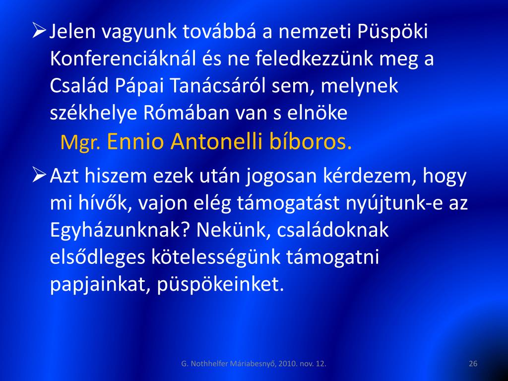 Jelen vagyunk továbbá a nemzeti Püspöki Konferenciáknál és ne feledkezzünk meg a Család Pápai Tanácsáról sem, melynek székhelye Rómában van s elnökeMgr. EnnioAntonelli bíboros. • Azt hiszem ezek után jogosan kérdezem, hogy mi hívők, vajon elég támogatást nyújtunk-e az Egyházunknak? Nekünk, családoknak elsődleges kötelességünk támogatni papjainkat, püspökeinket. G. Nothhelfer Máriabesnyő, 2010. nov. 12.