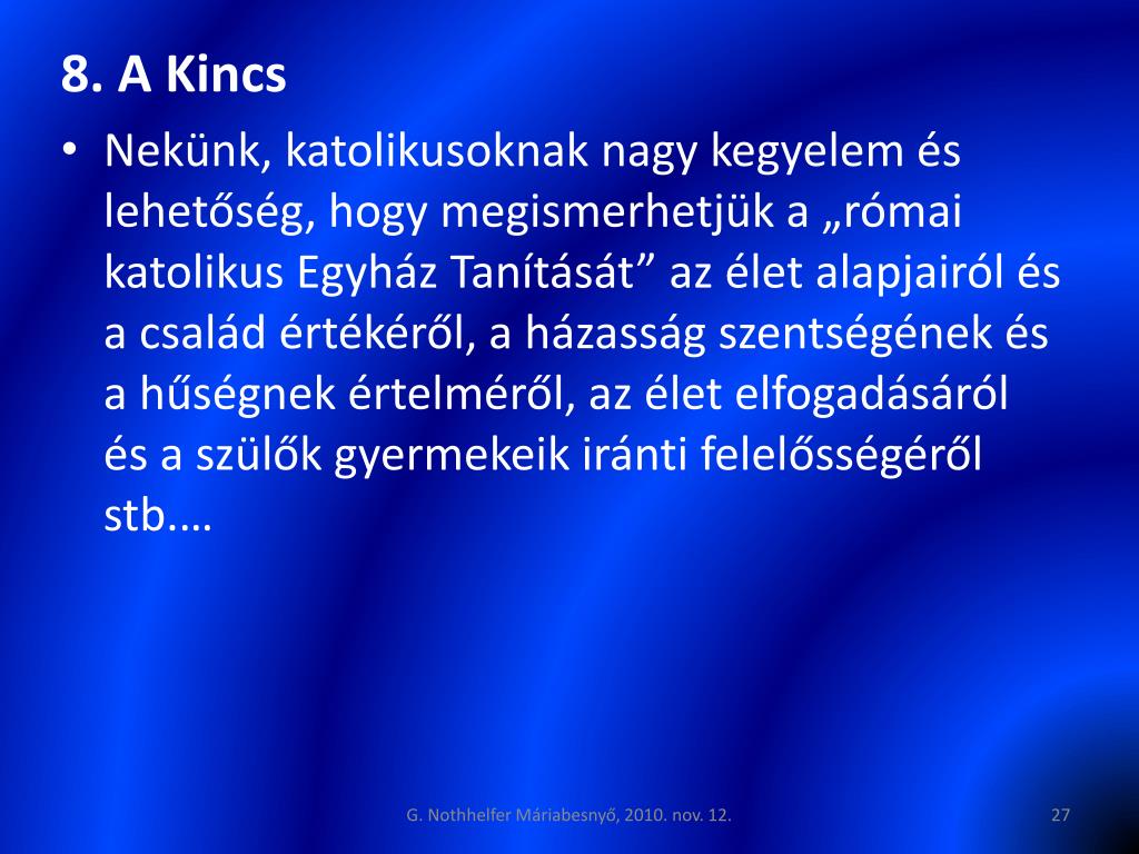 8. A Kincs • Nekünk, katolikusoknak nagy kegyelem és lehetőség, hogy megismerhetjük a „római katolikus Egyház Tanítását” az élet alapjairól és a család értékéről, a házasság szentségének és a hűségnek értelméről, az élet elfogadásáról és a szülők gyermekeik iránti felelősségéről stb.… G. Nothhelfer Máriabesnyő, 2010. nov. 12.