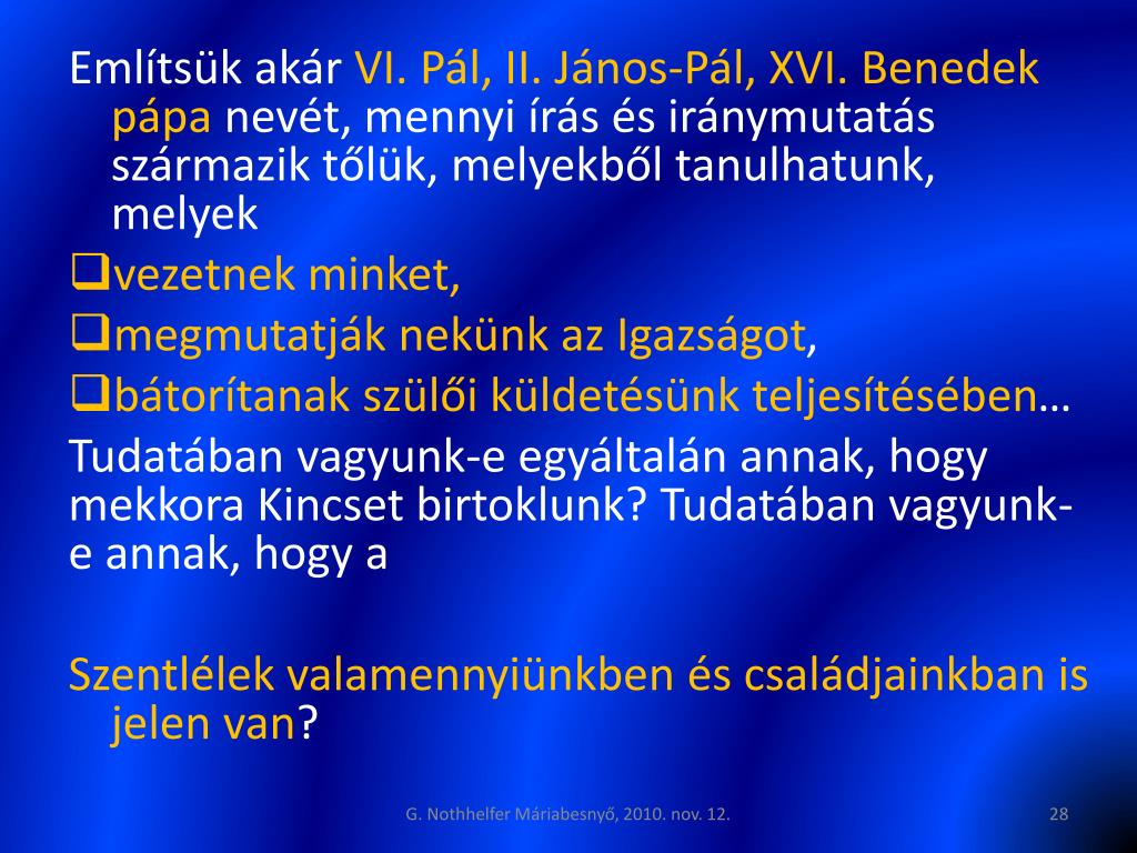 Említsük akár VI. Pál, II. János-Pál, XVI. Benedek pápa nevét, mennyi írás és iránymutatás származik tőlük, melyekből tanulhatunk, melyek • vezetnek minket, • megmutatják nekünk az Igazságot, • bátorítanak szülői küldetésünk teljesítésében… Tudatában vagyunk-e egyáltalán annak, hogy mekkora Kincset birtoklunk? Tudatában vagyunk-e annak, hogy a Szentlélek valamennyiünkben és családjainkban is jelen van? G. Nothhelfer Máriabesnyő, 2010. nov. 12.