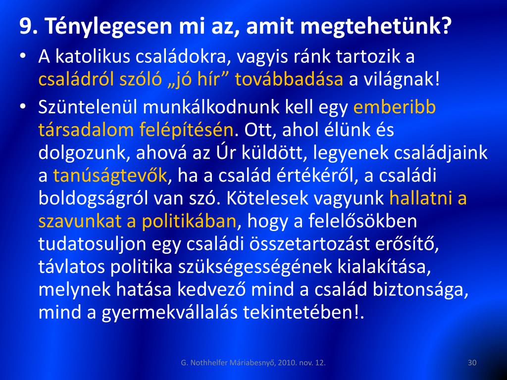 A püspökök arra kérik a családokat, hogy boldogságuk legyen tanúságtétel! XVI. Benedek pápa ezt mondja nekünk: „szüntelenül ajánljuk az új generációk figyelmébe a család, a házasság szépségét, mutassuk be, hogy ezen intézmények a szív legmélyebb kívánságaival állnak szoros kapcsolatban, s hogy általuk a személy méltósága társadalmi, sőt gazdasági szükségszerűséggé válik”! • Ha a környezetünk így vélekedik majd rólunk: ”Nézzétek, mennyire szeretik egymást”…akkor valóban tanúságot tettünk. Legyünk aktív szereplői a társadalomnak és legyünk tudatában annak, hogy harcunkat nem egyedül vívjuk. A Szűzanya mellettünk áll, és Ő győzni fog! ám ehhez ránk is szüksége van! G. Nothhelfer Máriabesnyő, 2010. nov. 12.