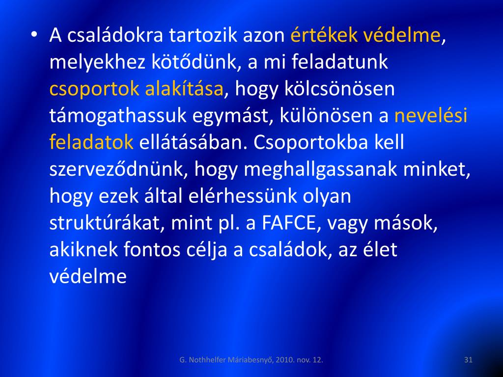 A családokra tartozik azon értékek védelme, melyekhez kötődünk, a mi feladatunk csoportok alakítása, hogy kölcsönösen támogathassuk egymást, különösen a nevelési feladatok ellátásában. Csoportokba kell szerveződnünk, hogy meghallgassanak minket, hogy ezek által elérhessünk olyan struktúrákat, mint pl. a FAFCE, vagy mások, akiknek fontos célja a családok, az élet védelme G. Nothhelfer Máriabesnyő, 2010. nov. 12.