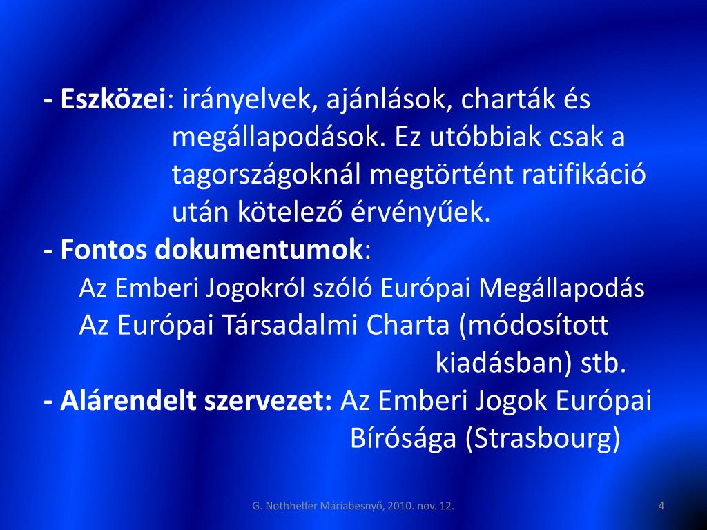 - Eszközei: irányelvek, ajánlások, charták és megállapodások. Ez utóbbiak csak a tagországoknál megtörtént ratifikáció után kötelező érvényűek. - Fontos dokumentumok:Az Emberi Jogokról szóló Európai Megállapodás Az Európai Társadalmi Charta (módosított kiadásban) stb. - Alárendelt szervezet: Az Emberi Jogok Európai Bírósága (Strasbourg) G. Nothhelfer Máriabesnyő, 2010. nov. 12.