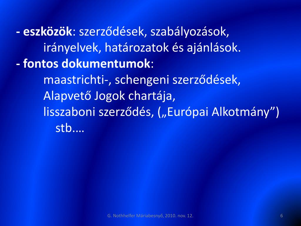 - eszközök: szerződések, szabályozások,irányelvek, határozatok és ajánlások. - fontos dokumentumok:maastrichti-, schengeni szerződések, Alapvető Jogok chartája,lisszaboni szerződés, („Európai Alkotmány”) stb.… G. Nothhelfer Máriabesnyő, 2010. nov. 12.