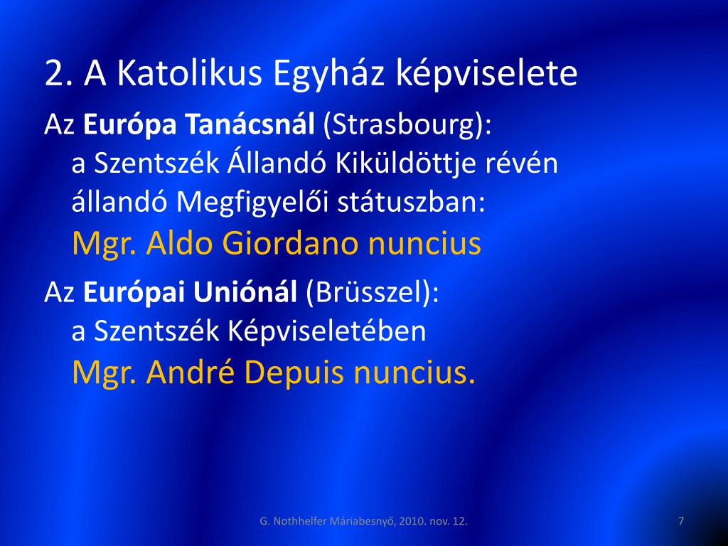 2. A Katolikus Egyház képviselete Az Európa Tanácsnál (Strasbourg): a Szentszék Állandó Kiküldöttje révénállandó Megfigyelői státuszban:Mgr. Aldo Giordano nuncius Az Európai Uniónál (Brüsszel): a Szentszék Képviseletében Mgr. André Depuis nuncius. G. Nothhelfer Máriabesnyő, 2010. nov. 12.