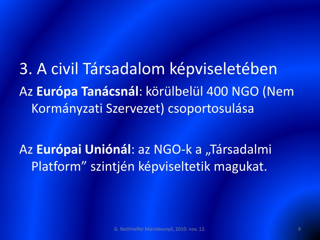 3. A civil Társadalom képviseletében Az Európa Tanácsnál: körülbelül 400 NGO (Nem Kormányzati Szervezet) csoportosulása Az Európai Uniónál: az NGO-ka „Társadalmi Platform” szintjén képviseltetik magukat. G. Nothhelfer Máriabesnyő, 2010. nov. 12.