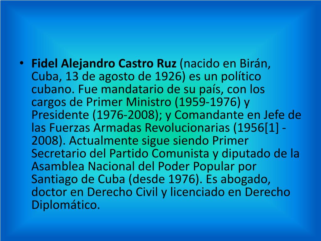 Fidel Alejandro Castro Ruz (nacido en Birán, Cuba, 13 de agosto de 1926) es un político cubano. Fue mandatario de su país, con los cargos de Primer Ministro (1959-1976) y Presidente (1976-2008); y Comandante en Jefe de las Fuerzas Armadas Revolucionarias (1956[1] -2008). Actualmente sigue siendo Primer Secretario del Partido Comunista y diputado de la Asamblea Nacional del Poder Popular por Santiago de Cuba (desde 1976). Es abogado, doctor en Derecho Civil y licenciado en Derecho Diplomático.