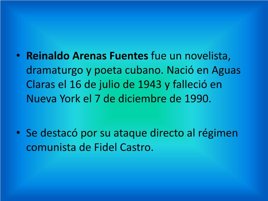 Reinaldo Arenas Fuentes fue un novelista, dramaturgo y poeta cubano. Nació en Aguas Claras el 16 de julio de 1943 y falleció en Nueva York el 7 de diciembre de 1990. • Se destacó por su ataque directo al régimen comunista de Fidel Castro.