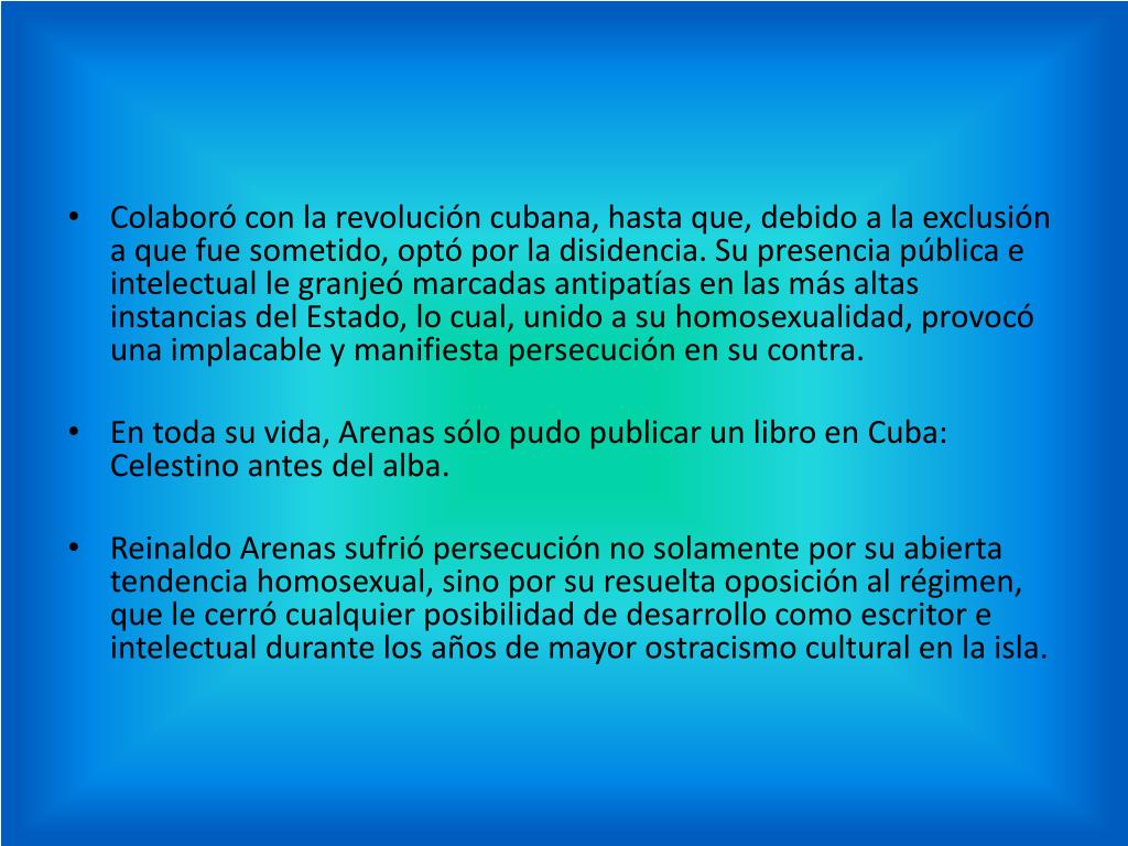 Colaboró con la revolución cubana, hasta que, debido a la exclusión a que fue sometido, optó por la disidencia. Su presencia pública e intelectual le granjeó marcadas antipatías en las más altas instancias del Estado, lo cual, unido a su homosexualidad, provocó una implacable y manifiesta persecución en su contra. • En toda su vida, Arenas sólo pudo publicar un libro en Cuba: Celestino antes del alba. • Reinaldo Arenas sufrió persecución no solamente por su abierta tendencia homosexual, sino por su resuelta oposición al régimen, que le cerró cualquier posibilidad de desarrollo como escritor e intelectual durante los años de mayor ostracismo cultural en la isla.