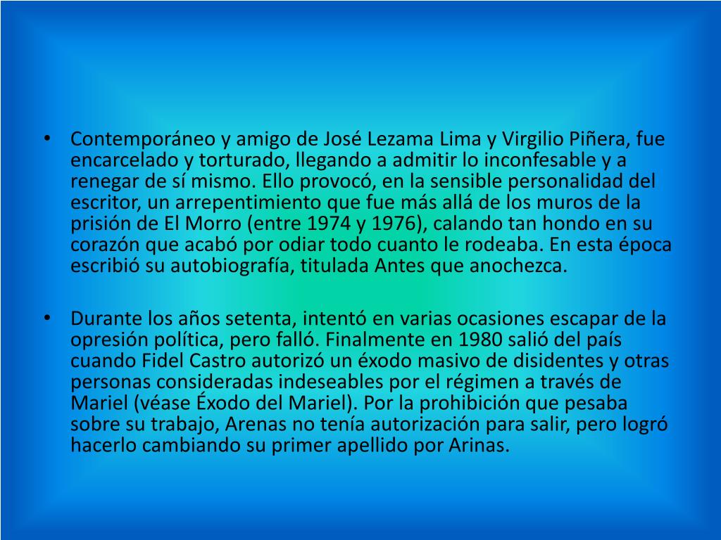 Contemporáneo y amigo de José Lezama Lima y Virgilio Piñera, fue encarcelado y torturado, llegando a admitir lo inconfesable y a renegar de sí mismo. Ello provocó, en la sensible personalidad del escritor, un arrepentimiento que fue más allá de los muros de la prisión de El Morro (entre 1974 y 1976), calando tan hondo en su corazón que acabó por odiar todo cuanto le rodeaba. En esta época escribió su autobiografía, titulada Antes que anochezca. • Durante los años setenta, intentó en varias ocasiones escapar de la opresión política, pero falló. Finalmente en 1980 salió del país cuando Fidel Castro autorizó un éxodo masivo de disidentes y otras personas consideradas indeseables por el régimen a través de Mariel (véase Éxodo del Mariel). Por la prohibición que pesaba sobre su trabajo, Arenas no tenía autorización para salir, pero logró hacerlo cambiando su primer apellido por Arinas.