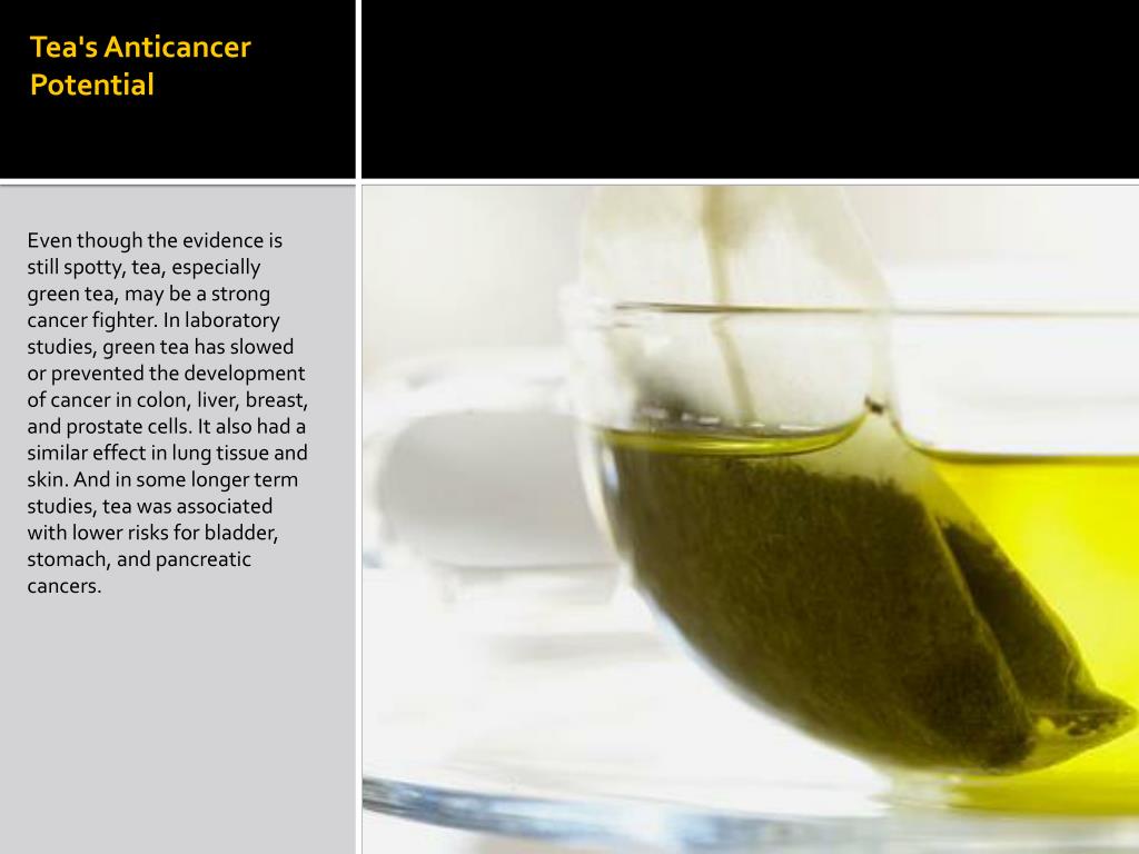 Tea's Anticancer Potential Even though the evidence is still spotty, tea, especially green tea, may be a strong cancer fighter. In laboratory studies, green tea has slowed or prevented the development of cancer in colon, liver, breast, and prostate cells. It also had a similar effect in lung tissue and skin. And in some longer term studies, tea was associated with lower risks for bladder, stomach, and pancreatic cancers.