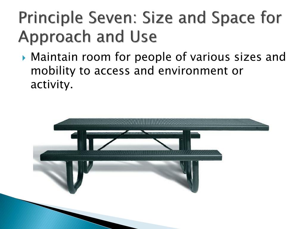 Principle Seven: Size and Space for Approach and Use • Maintain room for people of various sizes and mobility to access and environment or activity.