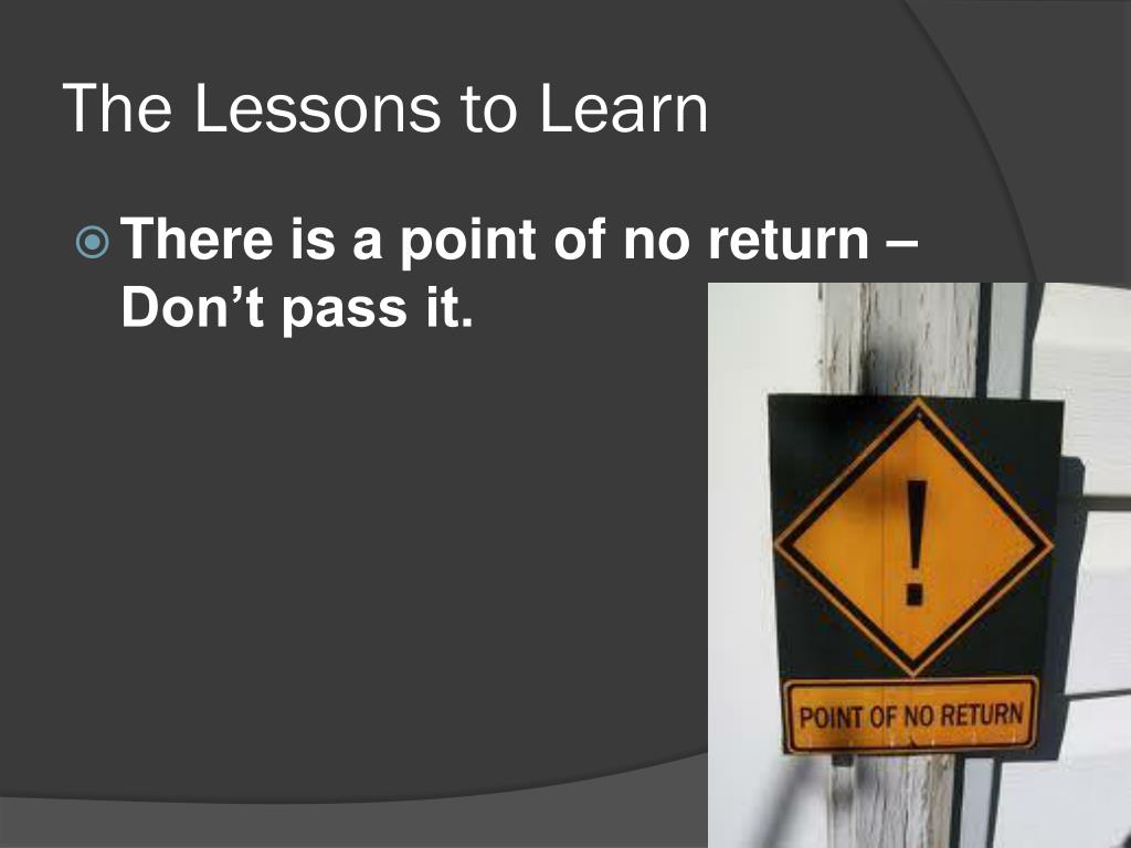 The Lessons to Learn • There is a point of no return – Don’t pass it. • God is always ready to forgive • We are not always ready to seek forgiveness, to repent, to change • If you are concerned – you have not gone too far.