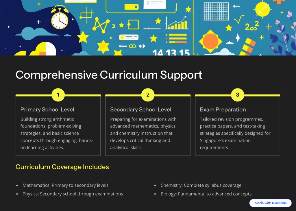 Comprehensive Curriculum Support 1 2 3 Primary School Level Secondary School Level Exam Preparation Building strong arithmetic foundations, problem-solving strategies, and basic science concepts through engaging, hands- on learning activities. Preparing for examinations with advanced mathematics, physics, and chemistry instruction that develops critical thinking and analytical skills. Tailored revision programmes, practice papers, and test-taking strategies specifically designed for Singapore's examination requirements. Curriculum Coverage Includes Mathematics: Primary to secondary levels Chemistry: Complete syllabus coverage Physics: Secondary school through examinations Biology: Fundamental to advanced concepts