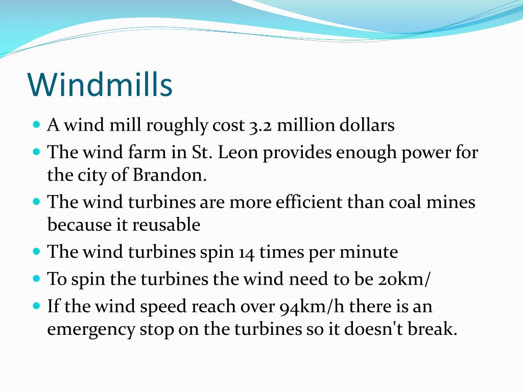 Windmills • A wind mill roughly cost 3.2 million dollars • The wind farm in St. Leon provides enough power for the city of Brandon. • The wind turbines are more efficient than coal mines because it reusable • The wind turbines spin 14 times per minute • To spin the turbines the wind need to be 20km/ • If the wind speed reach over 94km/h there is an emergency stop on the turbines so it doesn't break.