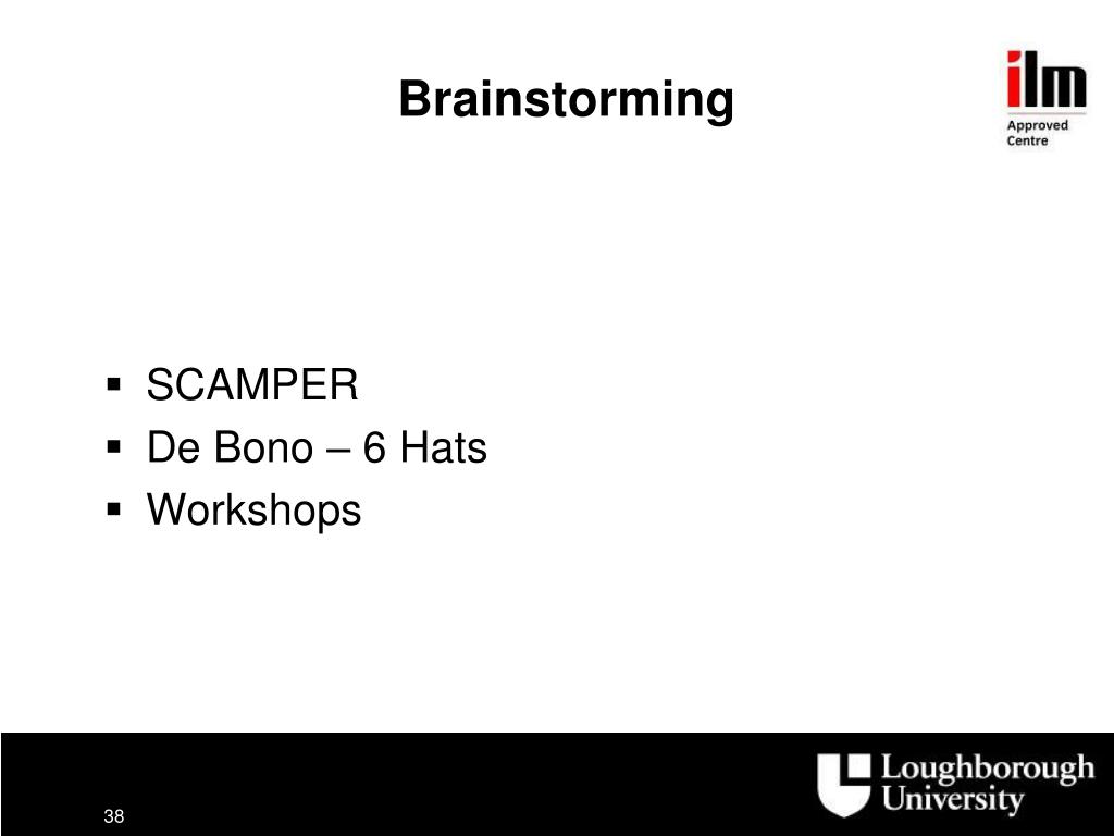 Brainstorming • SCAMPER • De Bono – 6 Hats • Workshops
