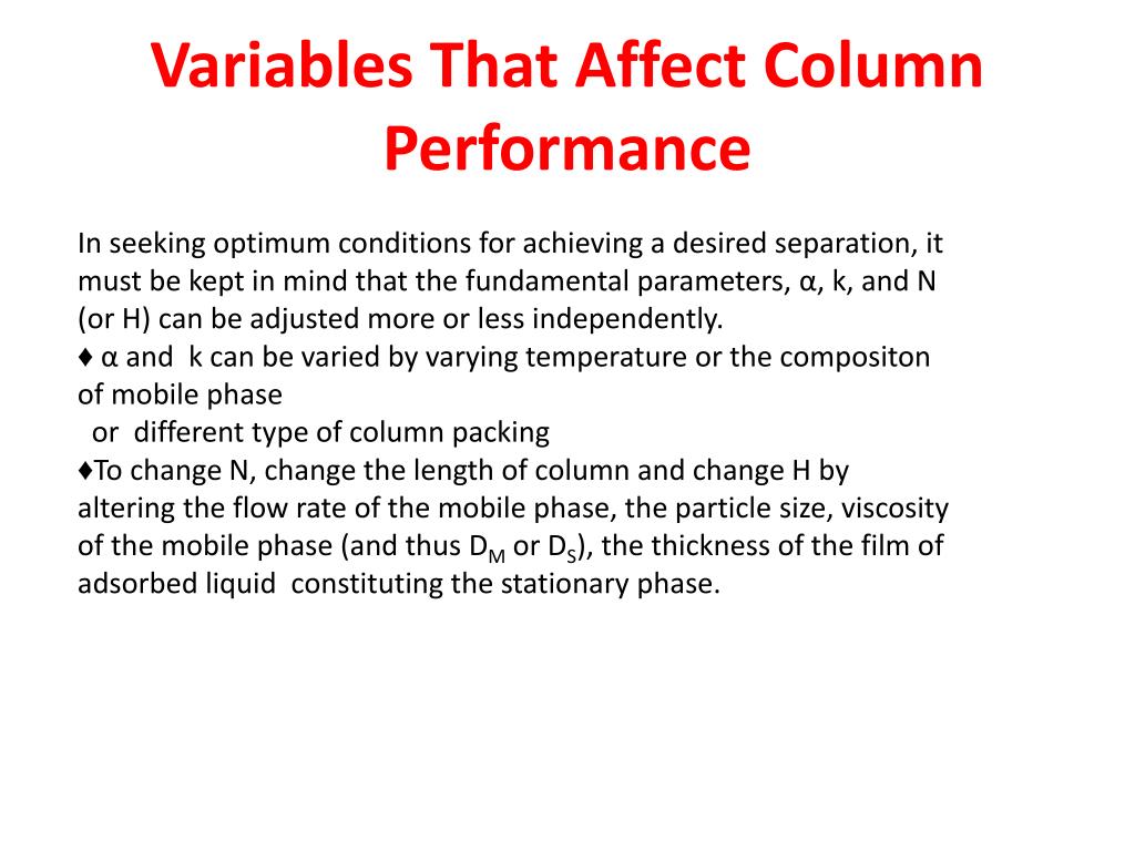 Variables That Affect Column Performance Inseeking optimum conditionsforachieving a desiredseparation, it must be kept in mindthatthefundamentalparameters, α, k, and N (or H) can be adjustedmoreorlessindependently. ♦ αand k can be variedbyvaryingtemperatureorthecompositon of mobile phase ordifferenttype of columnpacking ♦Tochange N, changethelength of columnandchange H byalteringtheflow rate of the mobile phase, theparticle size, viscosity of the mobile phase (andthus DMor DS), thethickness of the film of adsorbedliquidconstitutingthestationaryphase.