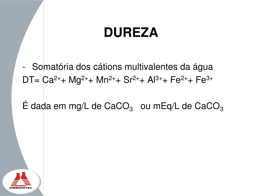DUREZA • Somatória dos cátions multivalentes da água DT= Ca2++ Mg2++ Mn2++ Sr2++ Al3++ Fe2++ Fe3+ É dada em mg/L de CaCO3 ou mEq/L de CaCO3