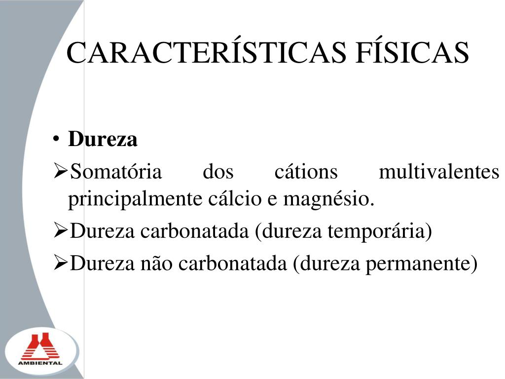 CARACTERÍSTICAS FÍSICAS • Dureza • Somatória dos cátions multivalentes principalmente cálcio e magnésio. • Dureza carbonatada (dureza temporária) • Dureza não carbonatada (dureza permanente)