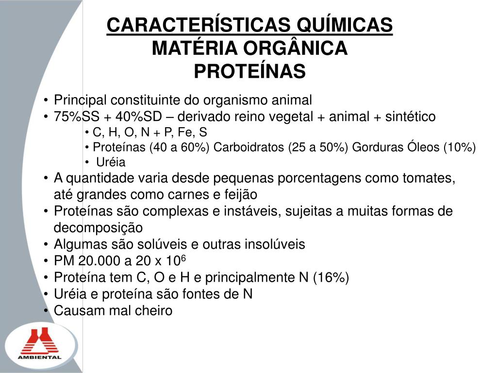 CARACTERÍSTICAS QUÍMICAS • Matéria orgânica • Carboidratos • Proteínas • Óleos e graxas