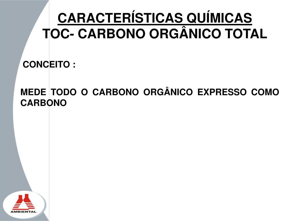 CARACTERÍSTICAS QUÍMICAS TOC- CARBONO ORGÂNICO TOTAL CONCEITO : MEDE TODO O CARBONO ORGÂNICO EXPRESSO COMO CARBONO