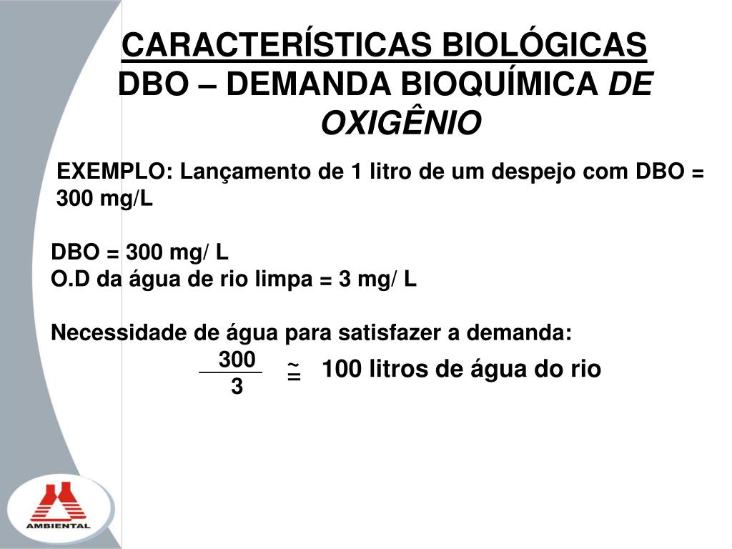 CARACTERÍSTICAS BIOLÓGICAS DBO5 – DEMANDA BIOQUÍMICA DE OXIGÊNIO CONCEITO : QUANTIDADE ESTIMADA DE OXIGÊNIO NECESSÁRIA PARA ESTABILIZAR A MATÉRIA ORGÂNICA BIODEGRADAVÉL. OU DIFERENÇA DO OXIGÊNIO DISSOLVIDO MEDIDO NO 1º E NO 5º DIA DBO5 = OD1 (mg/L) – OD5 (mg/L)