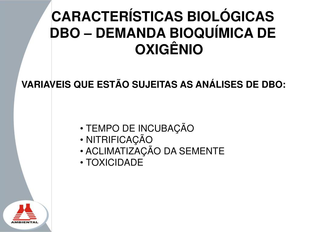 CARACTERÍSTICAS BIOLÓGICAS DBO – DEMANDA BIOQUÍMICA DE OXIGÊNIO VARIAVEIS QUE ESTÃO SUJEITAS AS ANÁLISES DE DBO: • TEMPO DE INCUBAÇÃO • NITRIFICAÇÃO • ACLIMATIZAÇÃO DA SEMENTE • TOXICIDADE