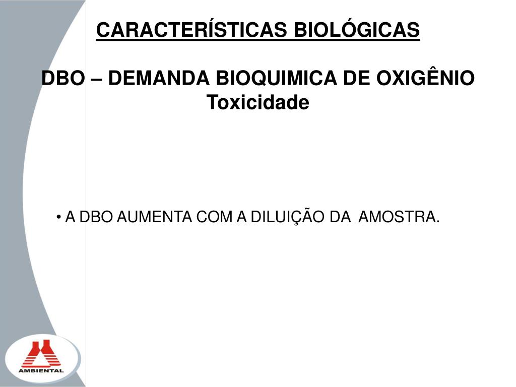 CARACTERÍSTICAS BIOLÓGICAS DBO – DEMANDA BIOQUIMICA DE OXIGÊNIO Toxicidade • A DBO AUMENTA COM A DILUIÇÃO DA AMOSTRA.