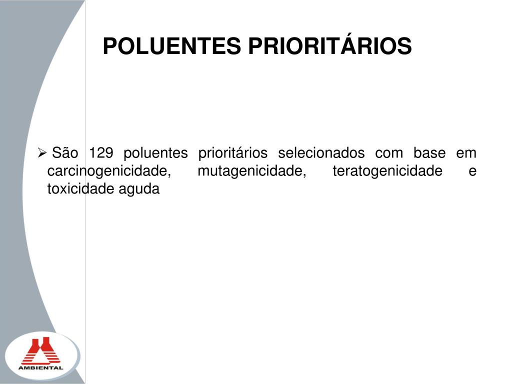 POLUENTES PRIORITÁRIOS • São 129 poluentes prioritários selecionados com base em carcinogenicidade, mutagenicidade, teratogenicidade e toxicidade aguda