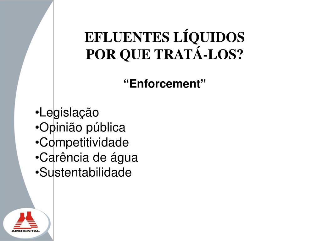 EFLUENTES LÍQUIDOS POR QUE TRATÁ-LOS? “Enforcement” • Legislação • Opinião pública • Competitividade • Carência de água • Sustentabilidade