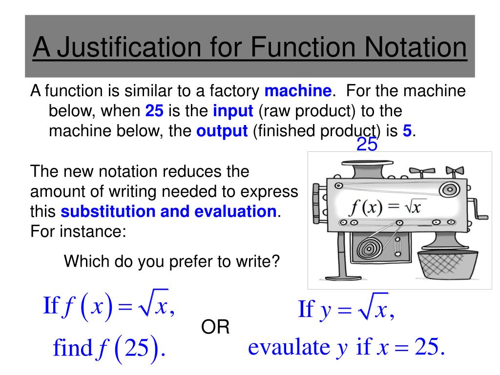 A Justification for Function Notation 25 The new notation reduces the amount of writing needed to express this substitution and evaluation. For instance: Which do you prefer to write? 5 OR A function is similar to a factory machine. For the machine below, when 25 is the input (raw product) to the machine below, the output (finished product) is 5.