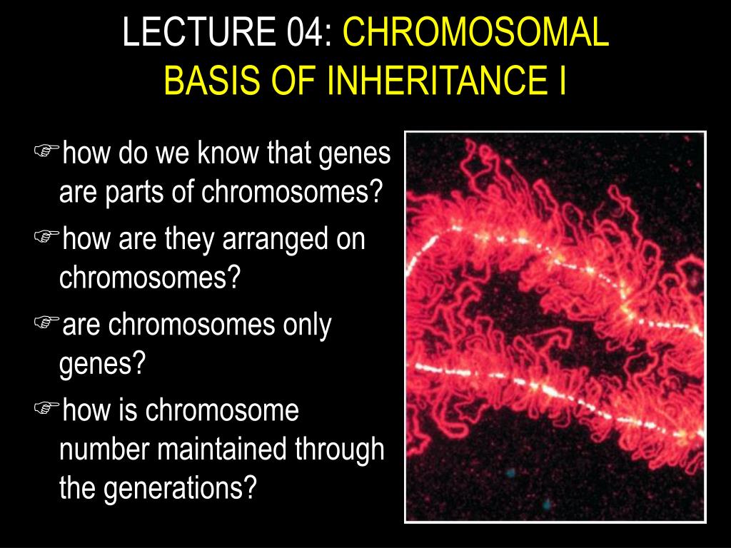 LECTURE 04: CHROMOSOMAL BASIS OF INHERITANCE I. how do we know that genes are parts of chromosomes? how are they arranged on chromosomes? are chromosomes only genes? how is chromosome number maintained through the generations?. LECTURE 04: CHROMOSOMAL BASIS OF INHERITANCE I.