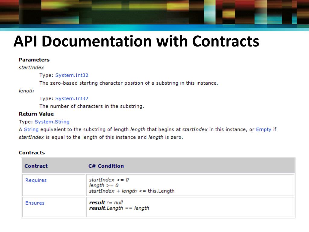 The CodeContracts Project Language-Agnostic Contracts for .NET Specifying Contracts in Code preconditions, postconditions, object invariants Runtime Checking Static Checking API Doc Generation