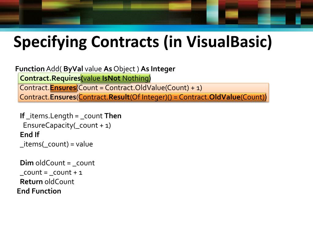 Specifying Contracts (in VisualBasic) Function Add( ByVal value As Object ) AsInteger Contract.Requires(value IsNot Nothing) Contract.Ensures(Count = Contract.OldValue(Count) + 1) Contract.Ensures(Contract.Result(Of Integer)() = Contract.OldValue(Count)) If _items.Length = _count Then EnsureCapacity(_count + 1) End If _items(_count) = value DimoldCount = _count _count = _count + 1 ReturnoldCount End Function