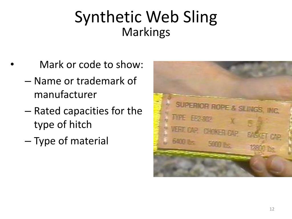 Synthetic Web SlingMarkings • Mark or code to show: • Name or trademark of manufacturer • Rated capacities for the type of hitch • Type of material