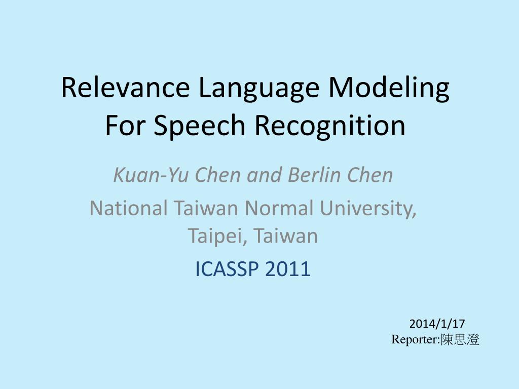 Relevance Language Modeling For Speech Recognition. Kuan-Yu Chen and Berlin Chen National Taiwan Normal University, Taipei, Taiwan ICASSP 2011. 2014/1/17 Reporter: 陳思澄. Outline. Introduction Basic Relevance Model(RM) Topic-based Relevance Model Modeling Pairwise Word Association
