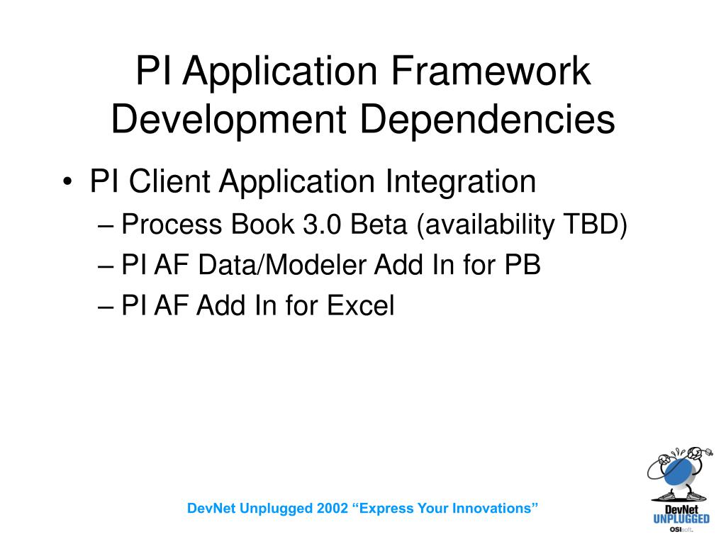 PI Application Framework Development Dependencies • PI Client Application Integration • Process Book 3.0 Beta (availability TBD) • PI AF Data/Modeler Add In for PB • PI AF Add In for Excel DevNet Unplugged 2002 “Express Your Innovations”