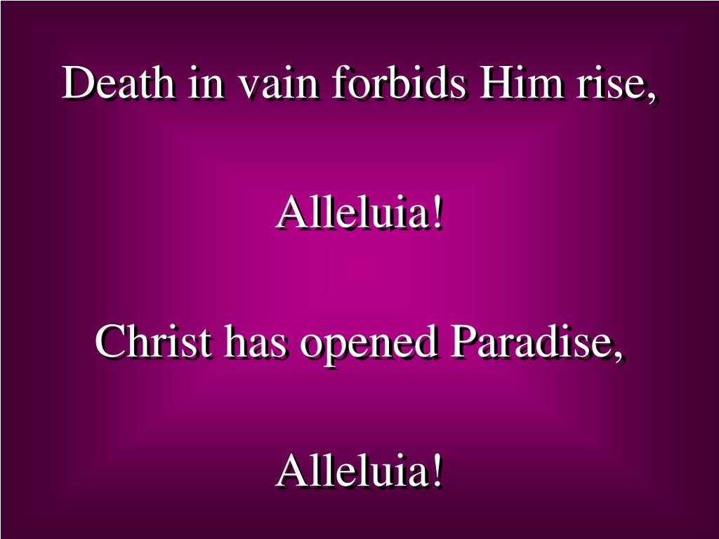 Death in vain forbids Him rise, Alleluia! Christ has opened Paradise, Alleluia!