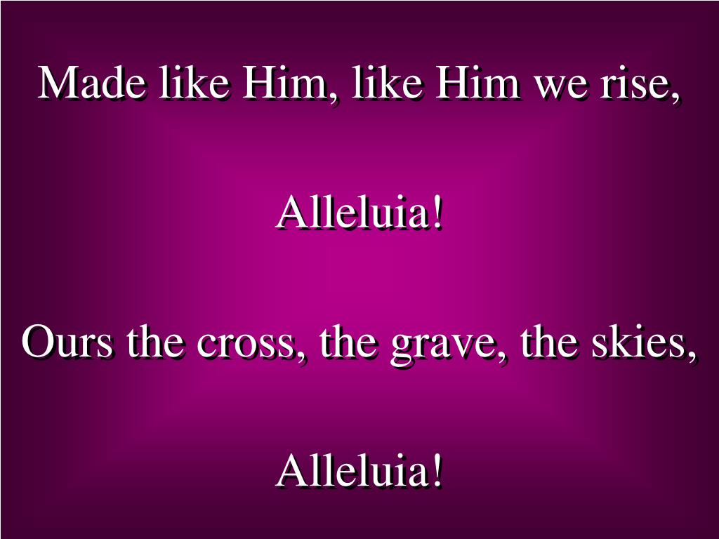 Made like Him, like Him we rise, Alleluia! Ours the cross, the grave, the skies, Alleluia!