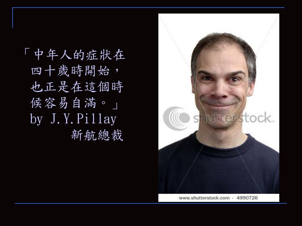 「中年人的症狀在四十歲時開始,也正是在這個時候容易自滿。」by J.Y.Pillay 新航總裁