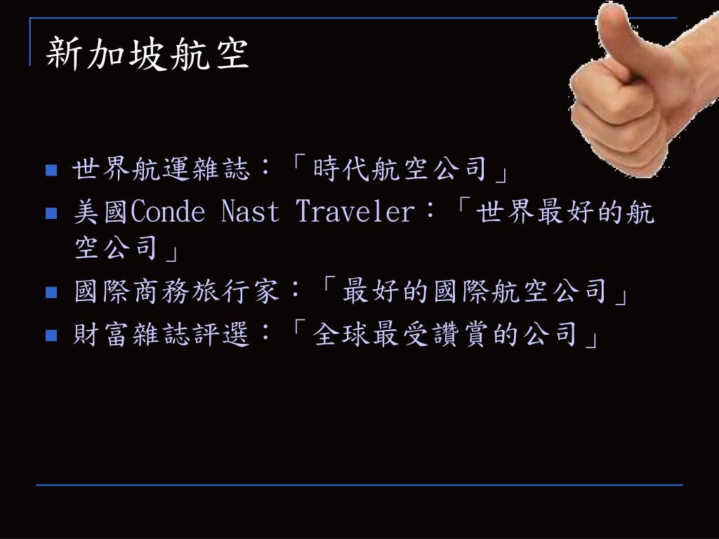 新加坡航空 • 世界航運雜誌:「時代航空公司」 • 美國Conde Nast Traveler:「世界最好的航空公司」 • 國際商務旅行家:「最好的國際航空公司」 • 財富雜誌評選:「全球最受讚賞的公司」