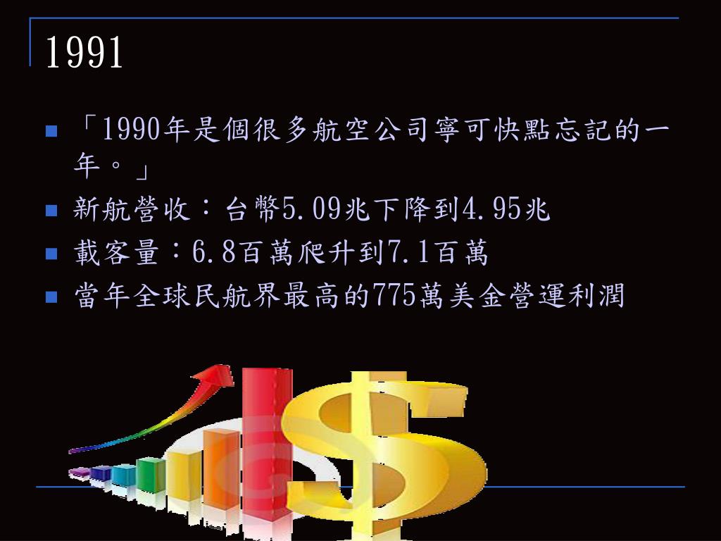 1991 • 「1990年是個很多航空公司寧可快點忘記的一年。」 • 新航營收:台幣5.09兆下降到4.95兆 • 載客量:6.8百萬爬升到7.1百萬 • 當年全球民航界最高的775萬美金營運利潤