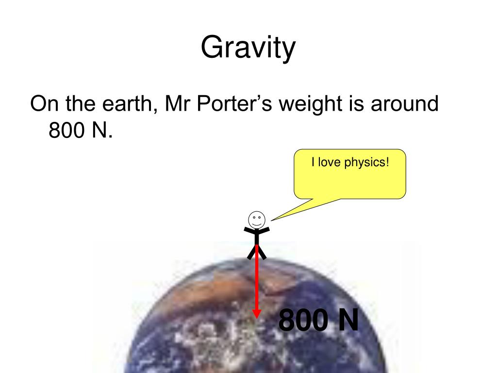 800 N Gravity On the earth, Mr Porter’s weight is around 800 N. I love physics!