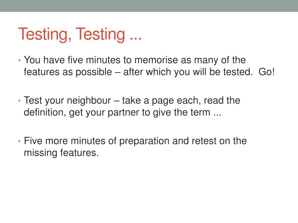 Testing, Testing ... • You have five minutes to memorise as many of the features as possible – after which you will be tested. Go! • Test your neighbour – take a page each, read the definition, get your partner to give the term ... • Five more minutes of preparation and retest on the missing features.