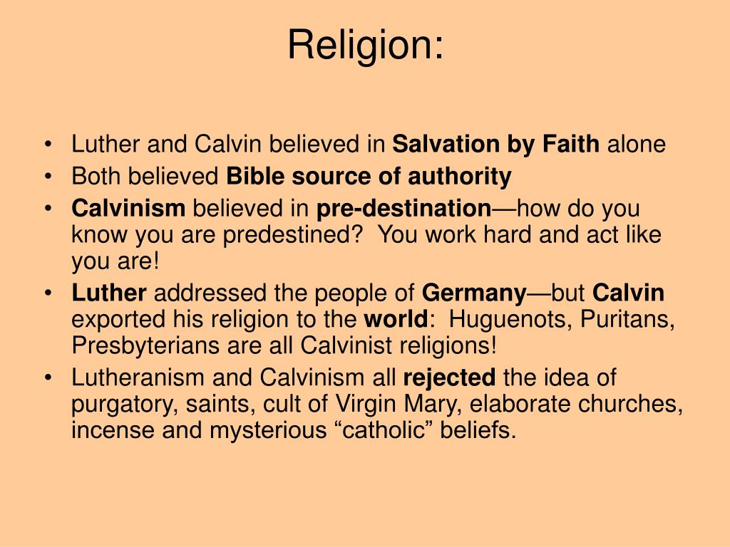 Religion: • Luther and Calvin believed in Salvation by Faith alone • Both believed Bible source of authority • Calvinism believed in pre-destination—how do you know you are predestined? You work hard and act like you are! • Luther addressed the people of Germany—but Calvin exported his religion to the world: Huguenots, Puritans, Presbyterians are all Calvinist religions! • Lutheranism and Calvinism all rejected the idea of purgatory, saints, cult of Virgin Mary, elaborate churches, incense and mysterious “catholic” beliefs.